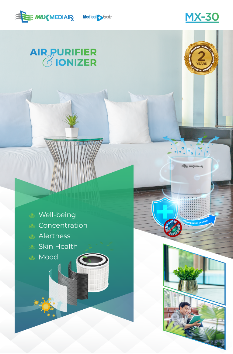 * Trung hòa bụi không khí. MaxMediair MX-30 với bộ lọc cấp độ y tế H13 True HEPA có thể trung hòa bụi không khí và cải thiện chất lượng không khí trong phòng của bạn.