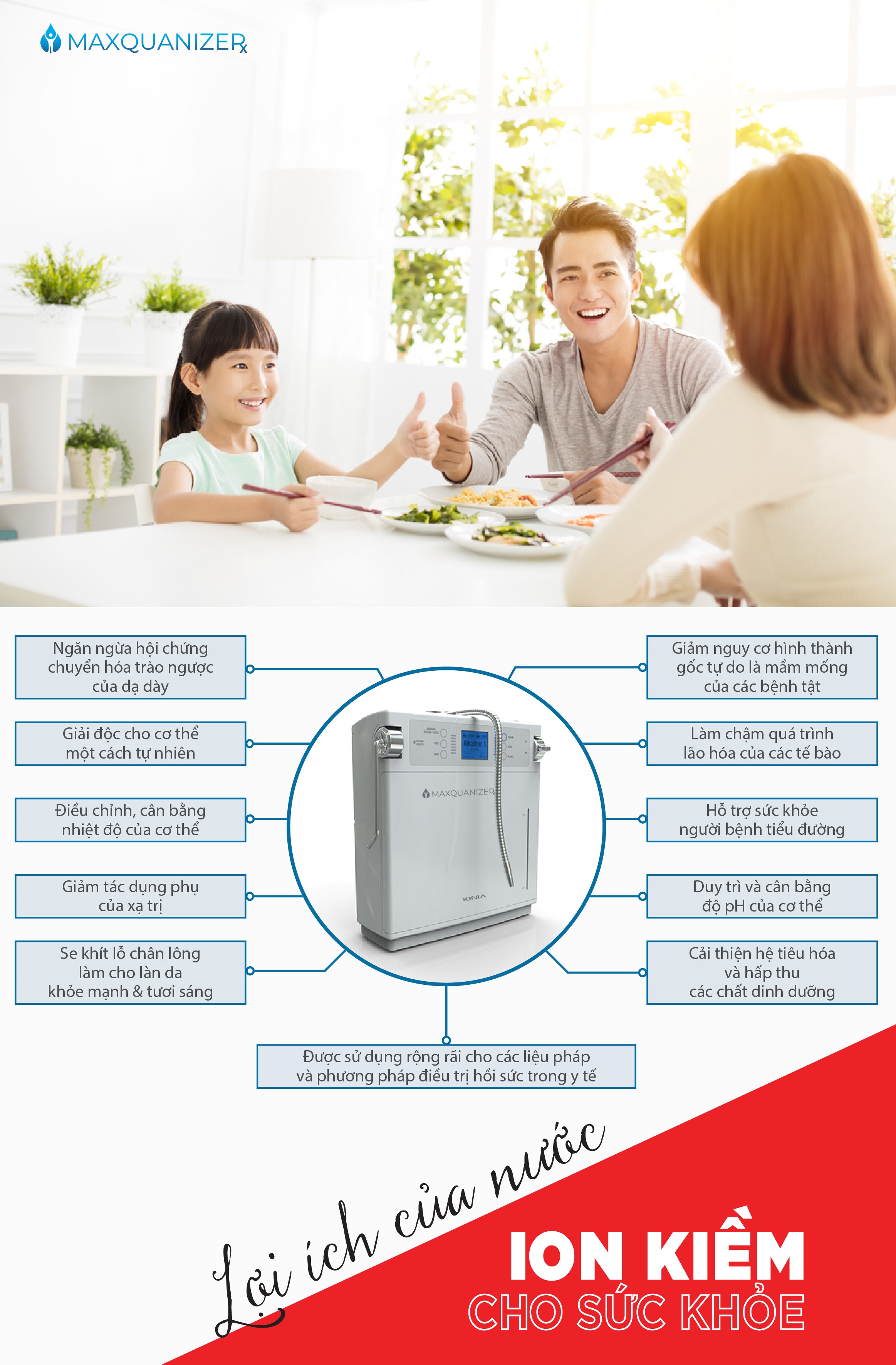 Như vậy có thể thấy, nước ion kiềm không những giàu tính kiềm, hydrogen và các chất chống oxy cao mà cònchứa rất nhiều khoáng chất tốt cho cơ thể. Loại nước này thực sự có những tác động tích cực đến sức khỏe con người. Việc uống nước ion kiềm thường xuyên giúp cơ thể bổ sung được lượng khoáng cần thiết, tăng cường năng lượng cho hoạt động hàng ngày và là dung dịch điện giải giúp điều hòa cơ thể hiệu quả, an toàn nhất.